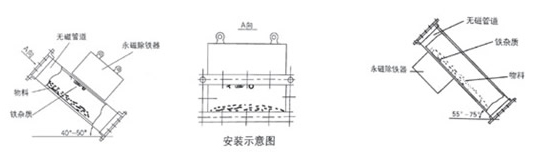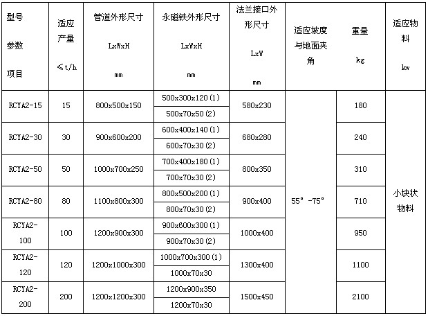 RCYA1、RCYA2系列管道式永磁除鐵器包括無(wú)磁管道和永磁鐵兩部分,****于對(duì)封閉管道內(nèi)非磁性物料除鐵、永磁除鐵器內(nèi)部采用高性能稀土強(qiáng)磁材料組成復(fù)合磁系。具有體積小、磁力大、重量輕、除鐵干凈、方便、無(wú)能耗、使用壽命長(zhǎng)等特點(diǎn)。適合于無(wú)輸送皮帶,只能提供下料溜槽的場(chǎng)合。當(dāng)散狀物料經(jīng)過(guò)管道式永磁除鐵器時(shí),鐵雜物被高場(chǎng)強(qiáng)的永磁鐵所吸附,清除鐵雜質(zhì)時(shí),打開(kāi)管道****門將雜質(zhì)取出。該設(shè)備適用于含鐵量較少的場(chǎng)合,含鐵較多的場(chǎng)合,應(yīng)選用自卸式除鐵器或RCYG系列精細(xì)除鐵器。主要應(yīng)用于水泥、化工、煤炭、塑料、耐火材料、建材等行業(yè)的下料管道中清除雜物。